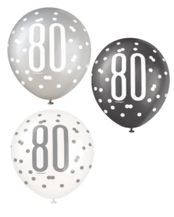 Lateksballonger (6stk): “80” – Sølv – 30cm