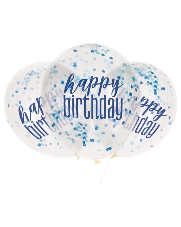 Lateksballonger (6stk): “Happy Birthday” – Konfetti – Blå & sølv – 30cm