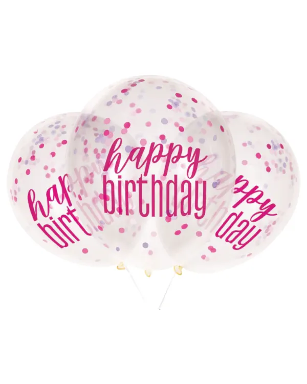 Lateksballonger (6stk): “Happy Birthday” – Konfetti – Rosa & sølv – 30cm