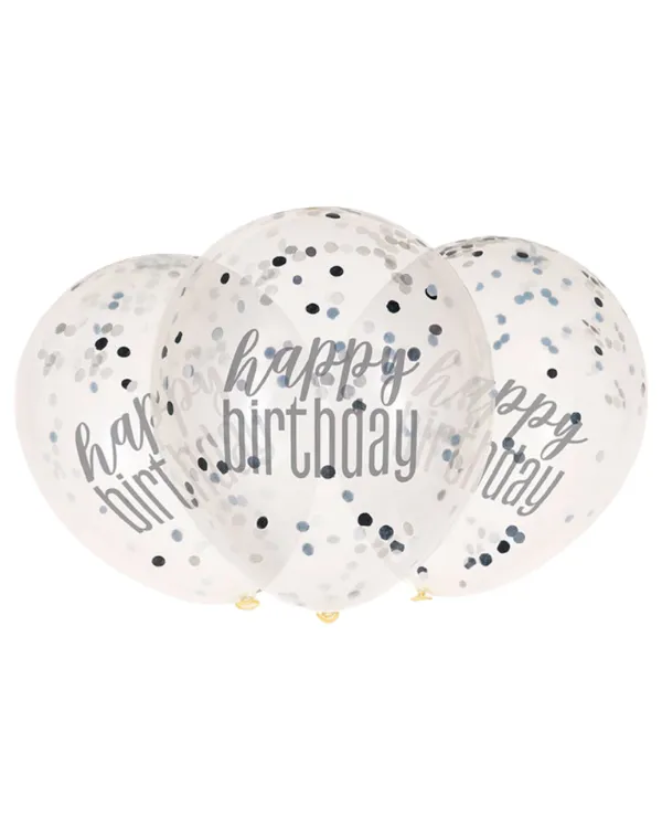 Lateksballonger (6stk): “Happy Birthday” – Konfetti – Svart & sølv – 30cm