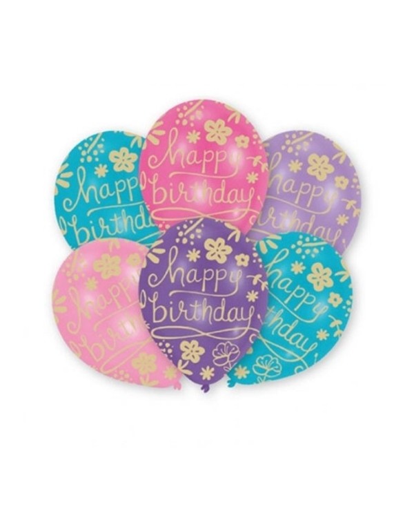 Lateksballonger (6stk): “Happy Birthday” med blomster – 27,5cm