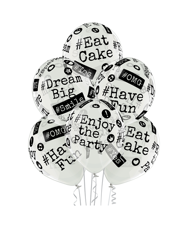 6 stk. Lateksballonger med kule “hashtags”. Kommer med crystal-farge som gir en fin og transparent bakgrunnsfarge. Ballongene kan bli opptil 30cm store når de blåses opp. Med emneknager slik som #EatCake, #OMG, #HaveFun og #DreamBig, så er disse ballongene perfekte til festlige lag. Få det ekstra gøy på festen med morsomme dekorasjoner fra The Balloon Company. Alle våre lateksballonger er nedbrytbare i naturen på lik linje med eksempelvis eikeblader.