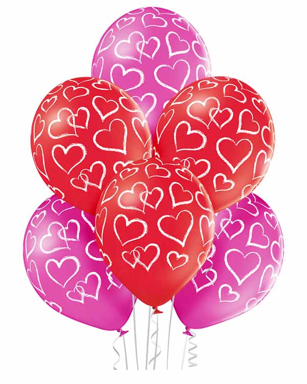 6stk lateksballong med to forskjellige pastellfarger i rosa og rødt. Ballongen er dekorert med vakre hvite hjerter som passer perfekt til romantiske anledninger. Ballongen kan bli opptil 30cm store når den blåses opp. Alle våre lateksballonger er nedbrytbare i naturen på lik linje med eksempelvis eikeblader.