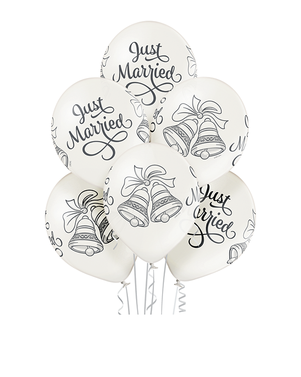 Lateksballonger (6stk): “Just Married” & Bryllupsklokker – 30cm – Pearl (Metallic)