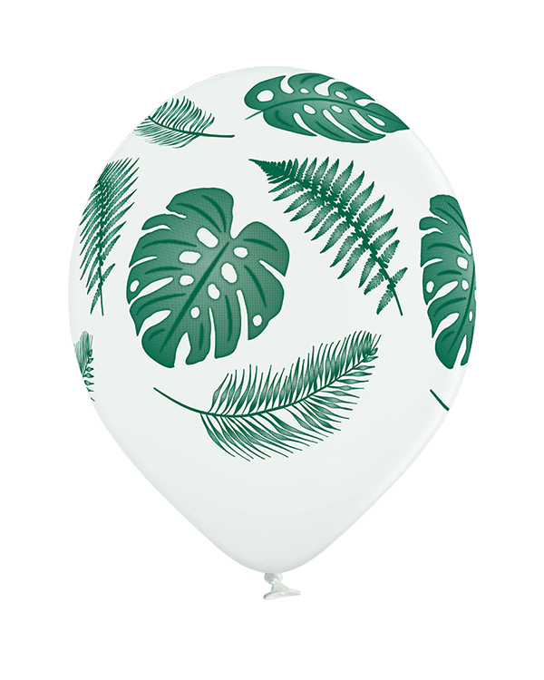 6 stk. Lateksballonger med hvit pastellfarge og grønne tropiske blader. Passer perfekt til sene sommerfester med friske og sommerlige farger. Ballongene kan bli opptil 30cm store når de blåses opp. Alle våre lateksballonger er nedbrytbare i naturen på lik linje med eksempelvis eikeblader.