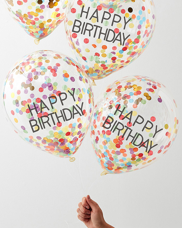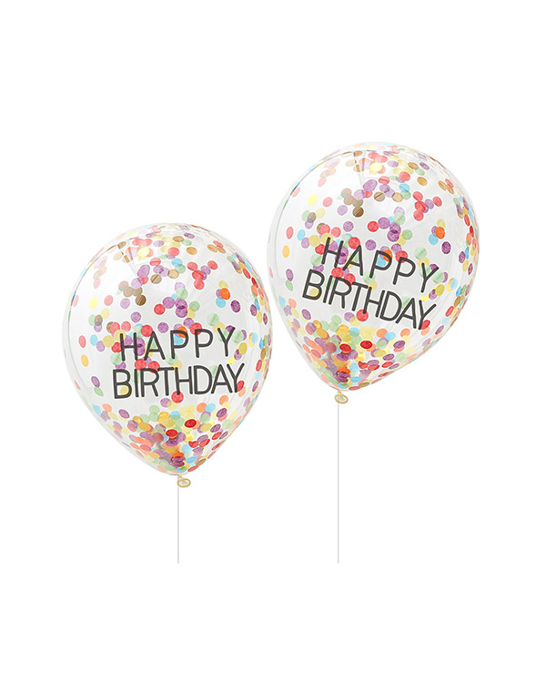 Lateksballonger / Konfettiballonger (5stk): “Happy Birthday” – Fargerik konfetti – 30cm