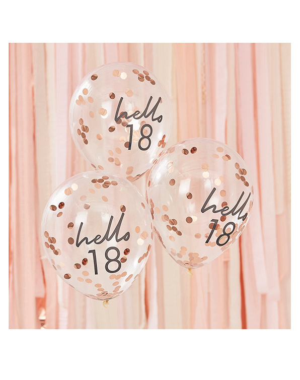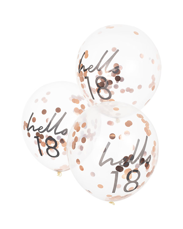 Lateksballonger / Konfettiballonger (5stk): “Hello 18” & Rosegull Konfetti – 30cm