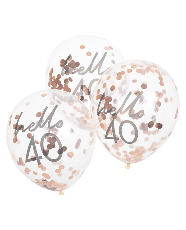 Lateksballonger / Konfettiballonger (5stk): “Hello 40” & Rosegull Konfetti – 30cm