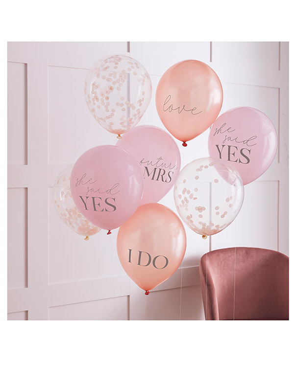 8 stk lateks/konfettiballonger. 3 gjennomsiktige ballonger med rosa konfetti, 2 rosa lateksballonger med teksten «She said yes», 1 rosa med «Future Mrs», en oransje med «I do» og en oransje med «Love». Lekker ballongbukett som passer perfekt som pynt på utdrikningslag. Alle våre lateksballonger er nedbrytbare på lik linje med et eikeblad. Ballongene kan bli opp til 30 cm når de blåses opp.