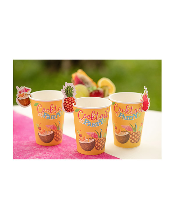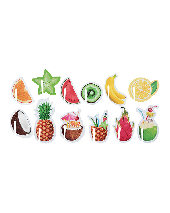 48 fargerike fruktmerker til å feste på glass eller kopper. Gjør det lille ekstra med pynten på sommerfesten og fest disse fruktmerkene på koppene. Eksotisk og lekkert! Merkene er i størrelse 4 x 6cm