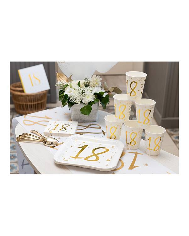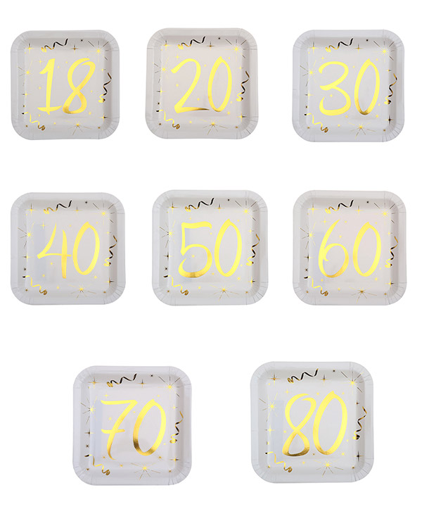 Firkantede, hvite tallerkener på 23cm med tall og gulldetaljer. Kommer med tallene 18, 20, 30, 40, 50, 60, 70 og 80. Velg tallerkenen med jubilantens tall på og gjør litt ekstra ut av den store dagen. Vi har mye annen pynt med tall på som for eksempel konfetti og ballonger.