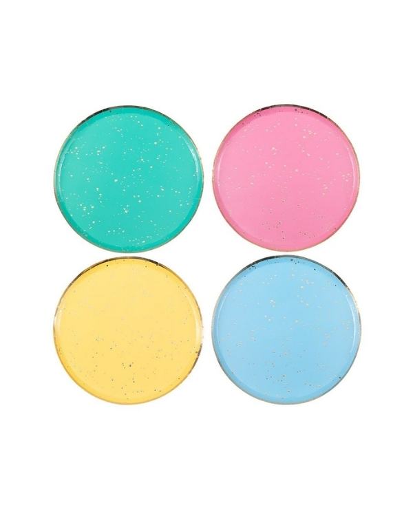 Legg til en farge med festmatene dine med disse lyse fargetallerkenene! > Hver pakke inneholder 8 gullflekker med regnbue festplater. Hver pakke inneholder 8 regnbue tallerkener: 2 x tallerkener med rødt og gullfarget 2 x tallerkener med gult og gull med flekker 2 x tallerkener med blå og gullflekker 2 x tallerkener og gullplater Hver tallerken måler 24,5 cm i diameter.