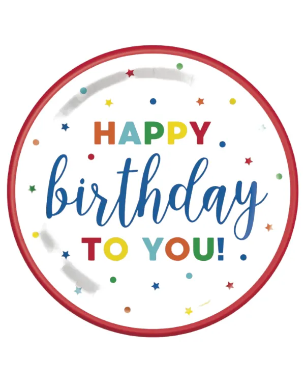 Tallerkener (8stk): “Happy Birthday” – Stjerner og sirkler – Fargerik – 22,86cm